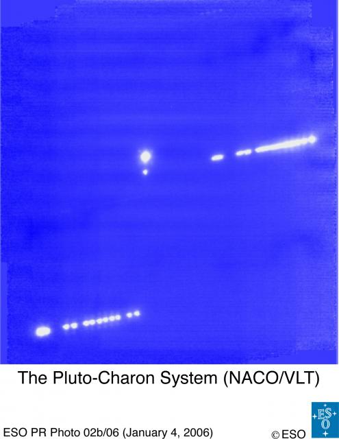 A composite of 13x13 arcsec wide images taken with the adaptive optics camera NACO on Yepun, one of the Unit Telescopes of ESO's VLT (Paranal). The images were taken in the K-band (2.2 microns) from about three hours to about one hour before the occultation. All images were centered on Pluto and Charon, the double object visible near the center, with a separation of about 0.9 arcsec. Because of the system's motion, the occulted star, at the right of Pluto and Charon, appears as a dotted trail, and so does another star in the lower left corner.